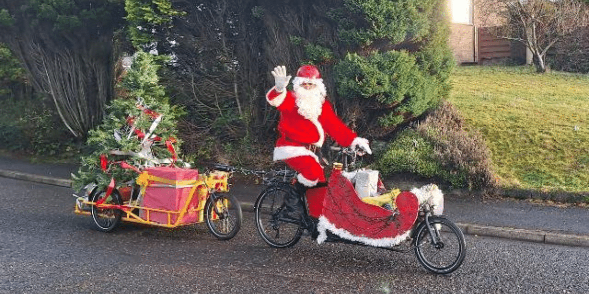Forget reindeer and sleighs. In Bishopbriggs, Scotland, Santa pedals into town on a brightly decorated cargo bike, turning heads and spreading holiday cheer. Thanks to BetterBriggs, a local Bishopbriggs non-profit, Santa does just this.